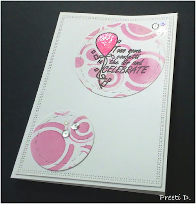 added hot pink glitter to the stamped balloon and then glossy accents to the balloon to make it pop and be the focal image. I have added the math element of cirlces- (geometrical shape) in this card through the use of circle stencil and circle die cuts :)